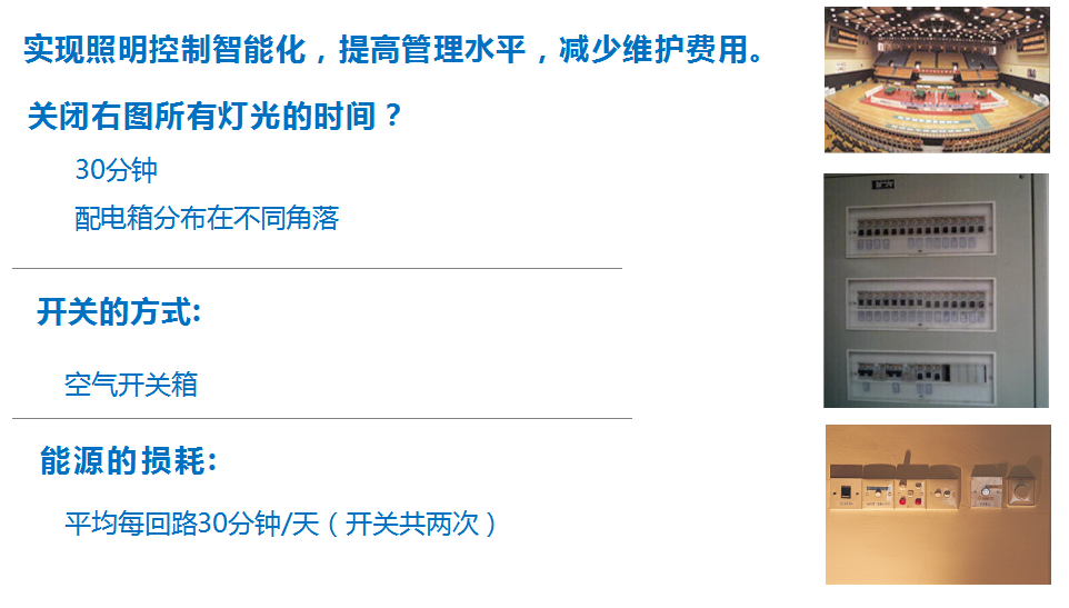 除了耗電量大,傳統照明控制還有一個無法長存的原因,那就是不便管理。傳統照明控制皆采用本地式一開一關的控制方式,沒有簡單的辦法實現全開全關。如上圖,在需要管理大面積燈光時,需要到不同角落的配電箱旁邊才能操作,費時費力費電。另外傳統照明控制所需的電力電纜較多,造成投資成本上升;沒有調光功能,亮度不合適時不能調節(jié),只能更換燈具;采用拇指開關或者翹班開關后無法再改變開關與燈具之間的對應關系;沒有場景操作,布線太過復雜,難以實現多控......傳統照明控制存在著很多問題,小家庭也許體會不到傳統照明控制的不便,因為家里燈具較少,一間房間一兩盞就夠了,但許多大型商業(yè)綜合體,寫字樓,體育館,博物館等場所,面積大、燈具成區(qū)域控制無法總控,且只能使用手動來開閉,其會造成很多多余工作量以及能源消耗。所以未來一定會進入智能照明時代,與VSU一起進入高效且節(jié)能的智能照明生活吧,VSU讓身邊更智能!
