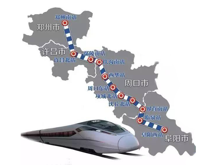 鄭阜鐵路北起鄭州南站,經(jīng)河南鄭州、開封、許昌、周口,進入安徽省阜陽,接入商合杭鐵路阜陽西站,線路全長267公里,工程總投資約427.2億元,其中安徽段長65公里,投資140億元,設(shè)計行車時速350公里。全線設(shè)鄭州南、許昌北、鄢陵南、扶溝南、西華、周口東、淮陽、沈丘北、界首南、臨泉、阜陽西等11座車站。鄭阜高鐵計劃今年8月開始聯(lián)調(diào)聯(lián)試,年內(nèi)建成通車,并與商合杭鐵路銜接,延伸到杭州。屆時鄭州到阜陽僅需1個多小時,鄭州到合肥僅需兩個多小時,到杭州也僅需3個多小時。