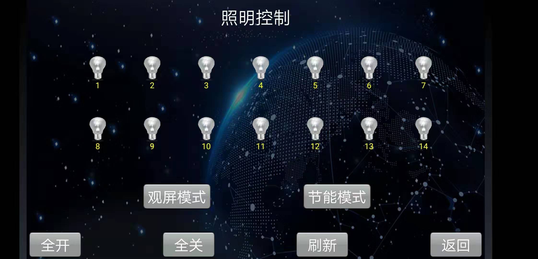 燈具:控制項目內的所有燈光照明,每個燈光回路可實現單獨控制,并設計了多種控制場景,如觀屏模式、節(jié)能模式、全開模式、全關模式等,使燈光控制變得更加智能、更加便捷。