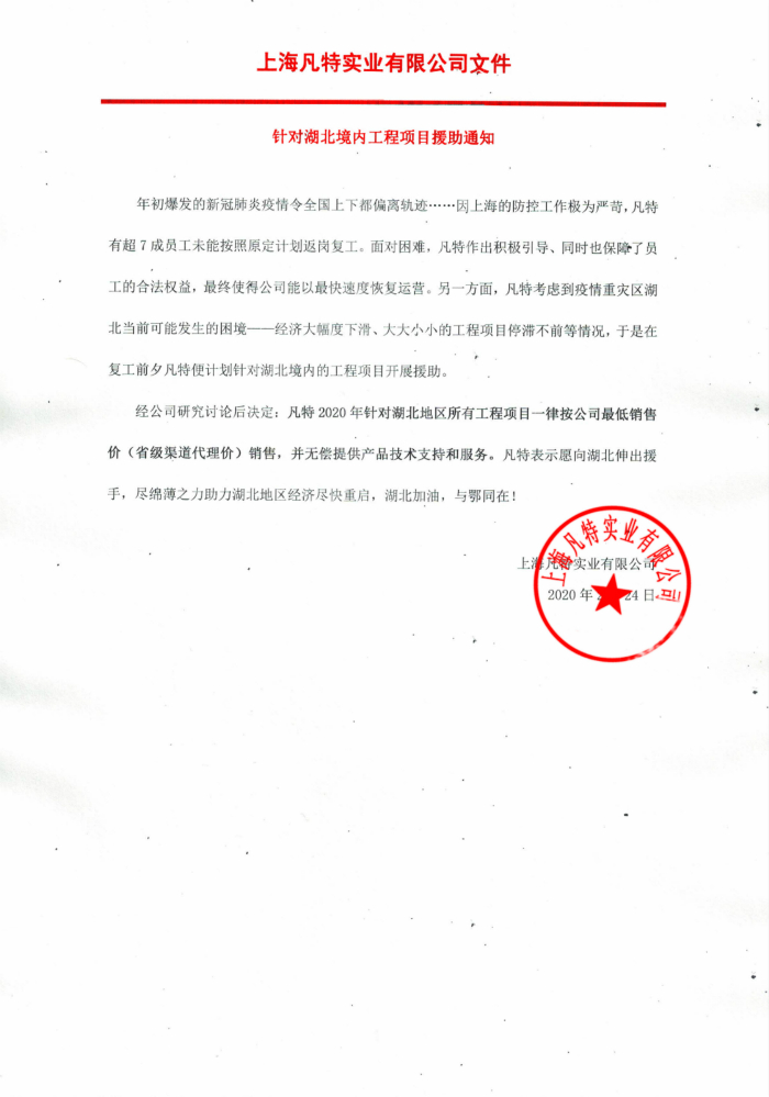 經(jīng)公司研究討論后決定:凡特2020年針對湖北地區(qū)所有工程項目一律按公司最低銷售價(省級渠道代理價)銷售,并無償提供產(chǎn)品技術(shù)支持和服務(wù)。凡特表示愿向湖北伸出援手,盡綿薄之力助力湖北地區(qū)經(jīng)濟盡快重啟,湖北加油,與鄂同在!