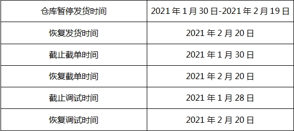 2021春節(jié)期間倉庫發(fā)貨及項目調(diào)試暫停通知